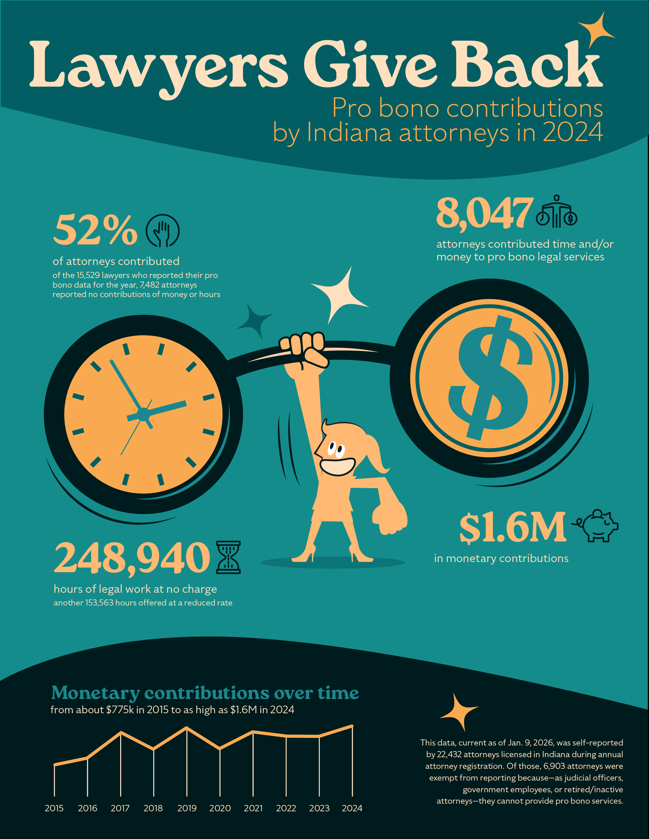 This infographic [PDF version] [text version] details self-reported pro bono contributions for calendar year 2024. More than 8,000 attorneys contributed time and/or money to those in need and gave $1.6 million to legal service groups.