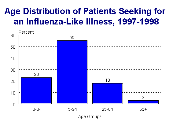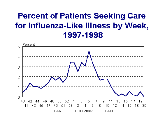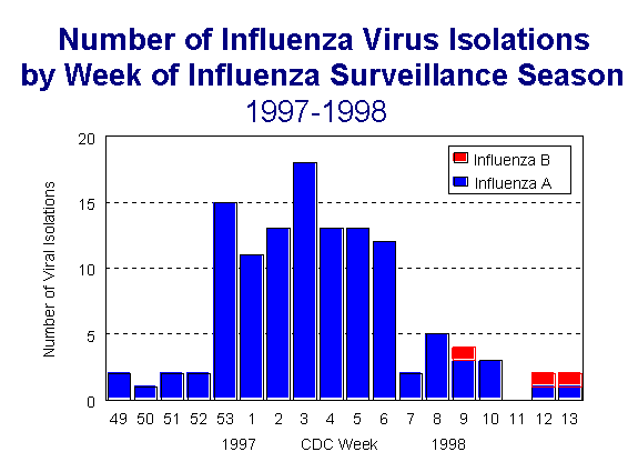The 1997-98 influenza season was slightly different than the 1996-97 season in that the first confirmed influenza case had an onset approximately 10 days later and a "new" Influenza A (H3N2) virus, A/Sydney, was circulating. Similar to 1996-97 season, the age groups most frequently seeking care for influenza-like illness in 97-98 was the 5-24 year old group. However, the 0-4 age group replaced the 25-64 age group(second most frequent group in 96-97) as the second most frequently seeking care. This change may be due to change in the mix of sentinel site practice types between the two years. Like the year before, in 97-98 surveillance period, Influenza A (H1N1) was not isolated in Indiana and Influenza B was not isolated until late in the season and only in a small number of cases.