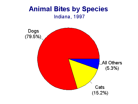 = 167/100,000A total of 9255 animal bites, an approximately 38% increase over 1996 (6,695), was reported in Indiana in 1997, for an incidence rate of 152 bites per 100,000 population. 2123 animal bites were reported from Marion County in 1997, accounting for almost 23% of the state total and yielding an incidence rate of 266 per 100,000 population. Because animal bites are frequently under-reported, the figures presented here should be considered minimums.