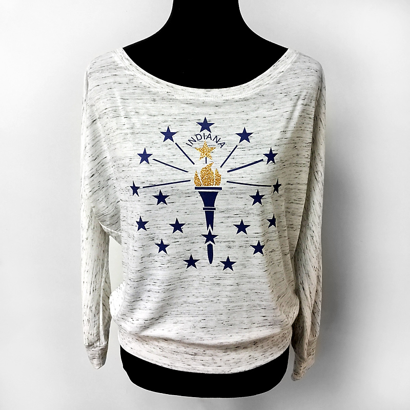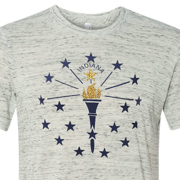 Super soft marbled t-shirt decorated with the torch and stars from the Indiana State Flag, topped off with a brilliant gold glitter flake material.